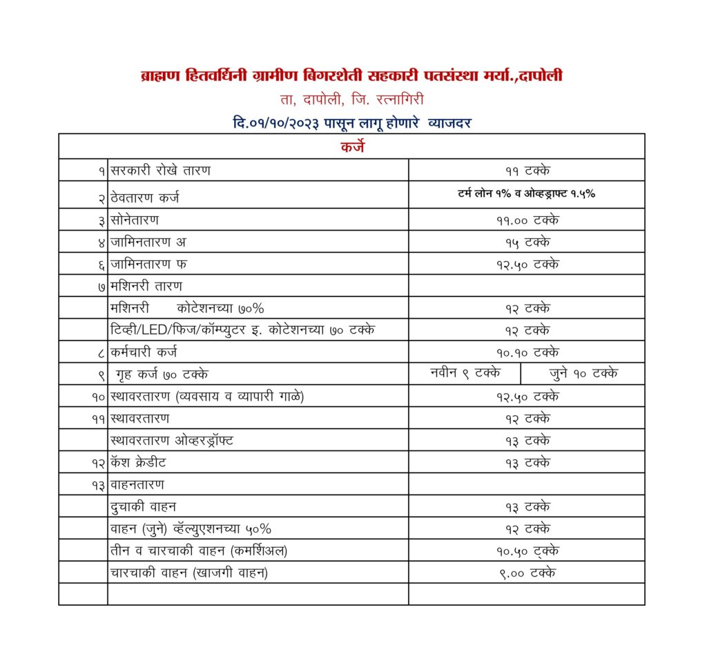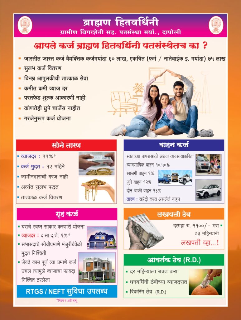 सभासदांची आर्थिक गरज पूर्ण करून त्यांची आर्थिक उन्नती साधणे हेच पतसंस्थेने मुख्य उद्दिष्ट आहे हे लक्षात घेऊन पतसंस्थेने सभासदांसाठी विविध कर्ज योजना तारणी विनाकारणी आखल्या आहेत तात्काळ मंजूर होणारी सोने तारण ठेवतारण सरकारी रोखे तारण कर्ज योजना आहेतच पण त्याचबरोबर सभासदांना विश्वासात घेऊन त्यांचे आर्थिक उत्पन्न पाहून रिपेमेंट पिरियड ठरविण्याचे स्वातंत्र्य ही पतसंस्थेने दिले आहे.